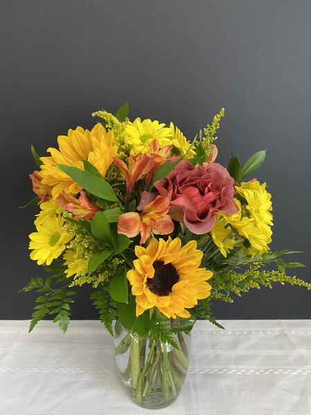 This colorful mixed arrangement is perfect for autumn! A variety of fall colored flowers to brighten anyone's day