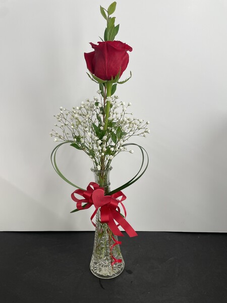 A single red rose arranged with greenery and babies breath. A heart made of lily grass adds a special touch for your Valentine!